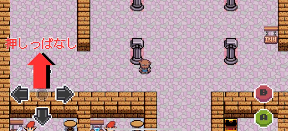 上ボタンを押しっぱなしで自動的に敵にエンカウントします。敵との戦闘は自動で終わるので、その後はまた上ボタンを押しっぱなしでOK!